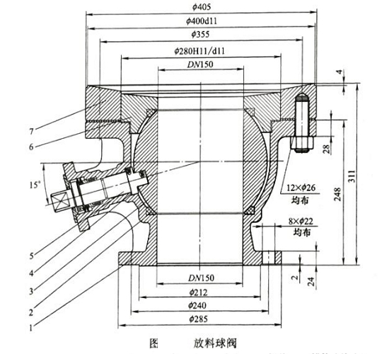 放料球阀是在浮动球阀结构的基础上,结合反应釜使用性能和操作条件设计而成的。如下图为球式放料阀的剖面图,其特点是关闭件为一带孔球体绕通道的垂线进行90°旋转,以达到开启或关闭的目的,球体两端各有一个氟塑料材料制成的密封圈,也称阀座。上密封圈装在反应釜底部放料口下侧凹槽内,这样可使球体紧贴在反应釜的底部,尽量减少球体上死角容积。考虑到制造上的分工和装配的方便,将釜底的放料口设计成一个特殊的凸缘盘,它作为球式放料阀的与反应釜相连接的部件,称为上体,其上表面按反应釜底面的要求加工成凸球面状,球面曲率与反应釜封头大致一样,上体中心放料孔与凹球面的交接处加工成大弧形的过渡面使放料口成为一个向上的喇叭口,上体下面则按球阀装配要求加工,放料口外为装配密封圈的环形槽,其外圈是连接阀体时的定位凸台,和阀体密封面间安装有调节垫片。在外面有均匀分布的螺纹孔,以装入双头螺栓与阀体连接。上体必须先装配镶焊于反应釜的底部,成为反应釜的一部分,打磨内表面焊缝,探伤合格后才能装上阀体、球体部件。阀体内的其他零件基本与通用球阀一致。这种构造的放料阀在关闭状态时部分球体凸出在放料口中,与喇叭口之间还留有一圈凹槽,有可能成为沉积物料的死角,但由于并不太深,槽的上口很宽大,料液容易受搅拌桨作用而翻起混合,可以避免料液的不完全反应现象。